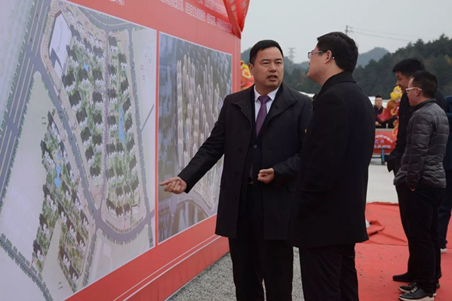 圖為集團董事長劉金成向茅箭區(qū)委副書記趙洪福介紹項目情況
