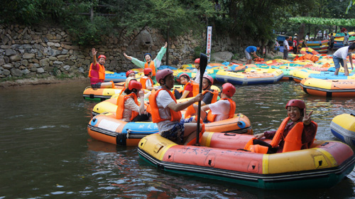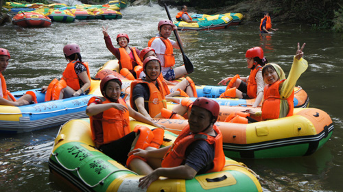 結(jié)束黃麻起義和鄂豫皖蘇區(qū)革命烈士陵園紅色主題教育活動后,團隊一行23人下午兩點來到了紅安縣對天河漂流景區(qū)探險漂流。紅安對天河探險漂流地處天臺山國家森林公園內(nèi),河道全長5.8公里,上下游落差143米,景區(qū)內(nèi)峽幽谷深、灘多浪急、古木參天、怪石林立、峭巖飛瀑、風(fēng)光迷人。團員們每兩人一個小組自由組合,相互協(xié)作登上橡皮艇,奔流而下,一路搏急浪、滑奇石,沿途藤蔓錯雜、奇石飛瀑的叢林風(fēng)光也讓大家大飽眼福。歡笑聲、驚呼聲、尖叫聲不絕于耳,氣氛熱鬧異常。