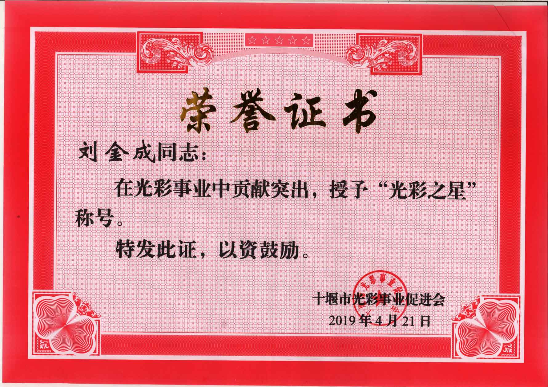 展,作出了積極貢獻。漢成能源集團董事長劉金成同志在光彩事業(yè)中貢獻突出榮獲“光彩之星”榮譽稱號。