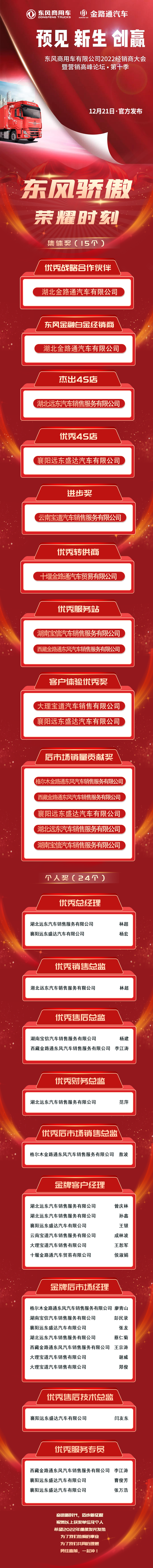 當天下午舉行的“東風驕傲”頒獎典禮上,現場頒發(fā)了2021年度優(yōu)秀戰(zhàn)略合作伙伴、杰出4S店、優(yōu)秀4S店、優(yōu)秀服務站、客戶體驗優(yōu)秀獎、后市場銷量貢獻獎、優(yōu)秀總經理、優(yōu)秀銷售總監(jiān)等各獎項。值得一提的是,金路通集團共獲得集體獎15項、個人獎24項,并榮獲東風商用車2021年度“優(yōu)秀戰(zhàn)略合作伙伴”。(汽貿事業(yè)部供稿)